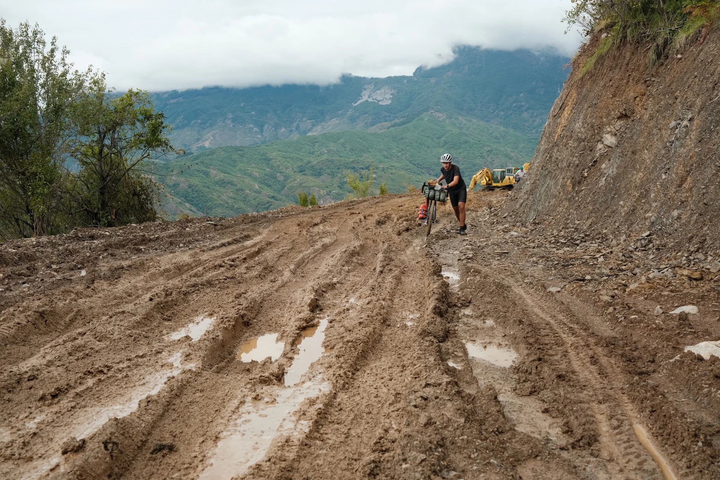 At around 500 meters of elevation, we reached the tiny village of Kir, where there was little more than a few excavators and a small café housed in a shed. The café offered only soft drinks and Turkish coffee. Stray dogs roamed around the café. After a quick stop, we pushed on, but the nice gravel soon turned into a rocky and muddy mountain road. At one point, the mud became so thick that we had to walk our bikes through the mess — there was no way to ride it.